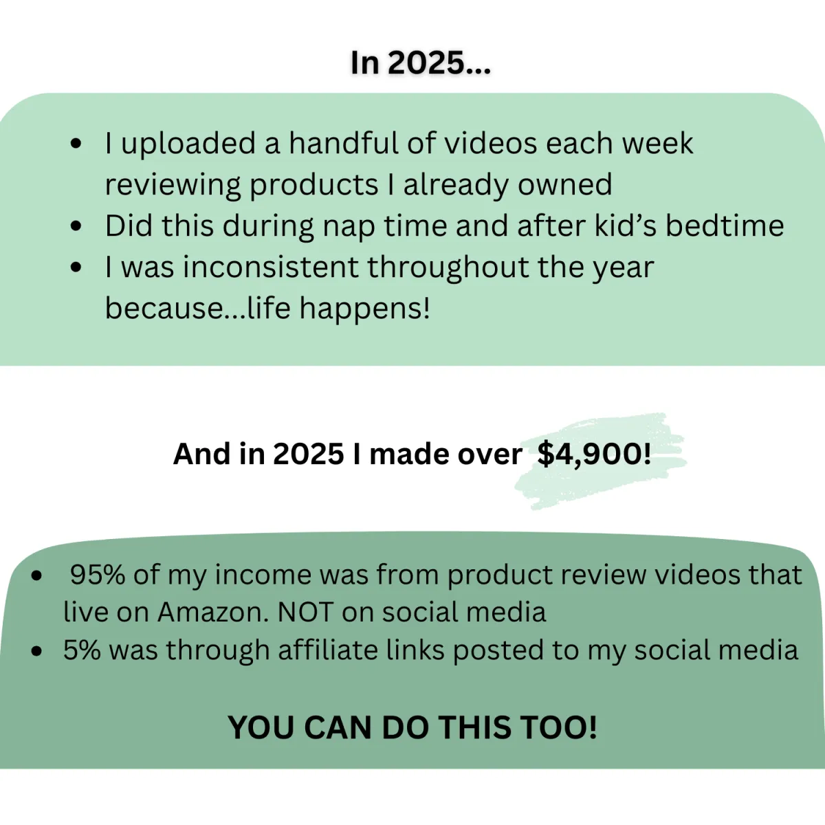 In 2025, my first full year of being in the Amazon Influencer Program, I made almost $5,000 from posting honest product review videos on Amazon. Now knowing the ins and outs of UGC and AIP, I plan to exceed that income each year going forward. I did not spend countless hours editing videos before posting, just did it in my free time or while the kids were napping. YOU can do this too!